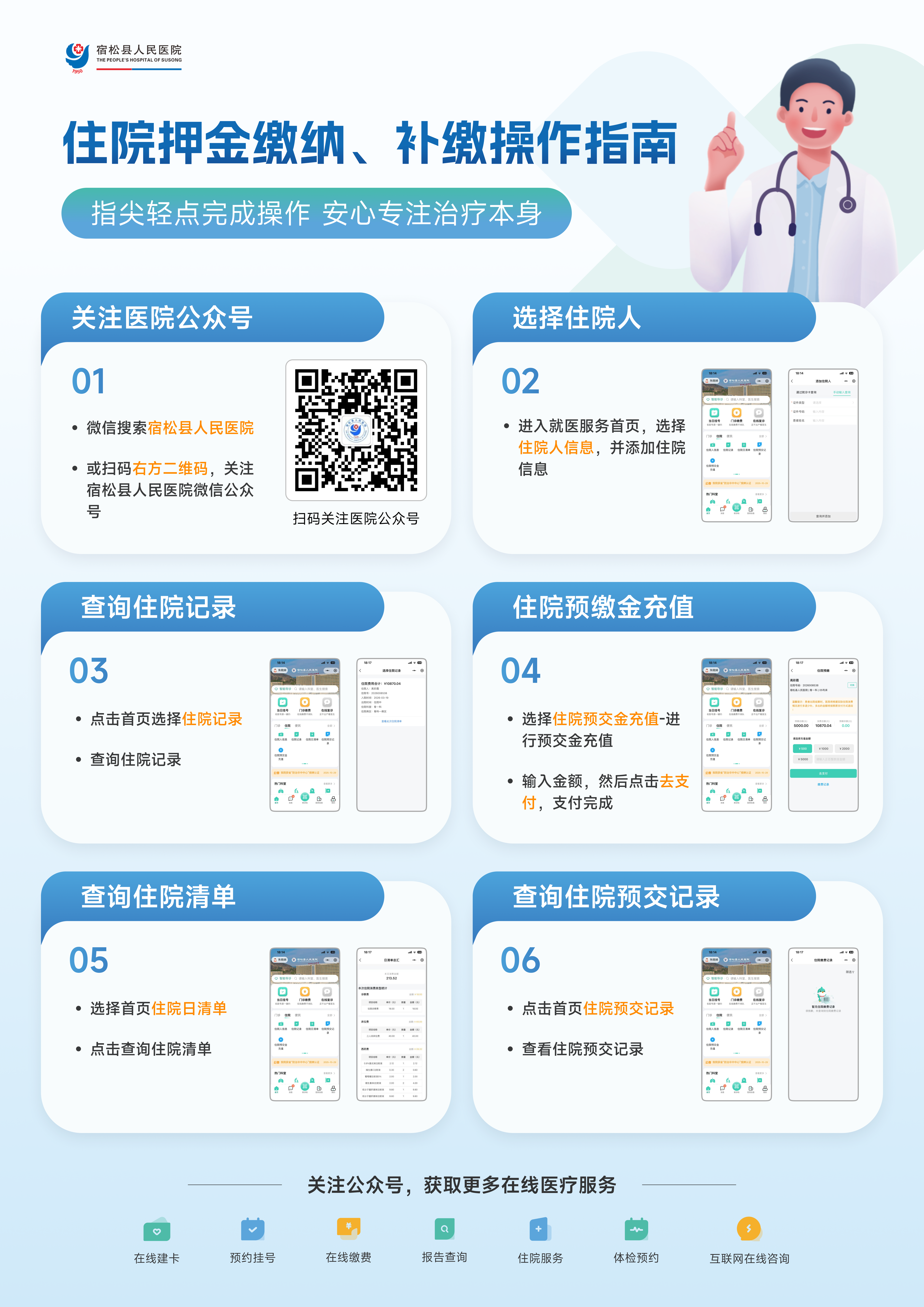- 关注“宿松县人民医院”官方微信公众号,点击底部菜单栏“就医服务”即可进入;