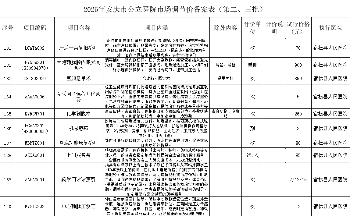 2025年安庆市公立医院市场调节价备案表(第二、三批)