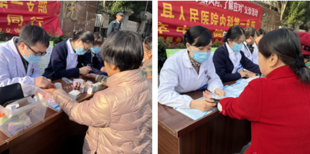 活动中,我院医务人员为前来咨询的群众免费测量血压、血糖。通过发放宣传资料、面对面讲解等方式,就糖尿病预防、糖尿病的并发症等健康知识进行科普宣传。并为有需求的糖友现场演示血糖监测方法及胰岛素注射方法,同时就患者在饮食控制、规律服药、监测血糖和体育锻炼中应该注意的事项给予了具体的指导。