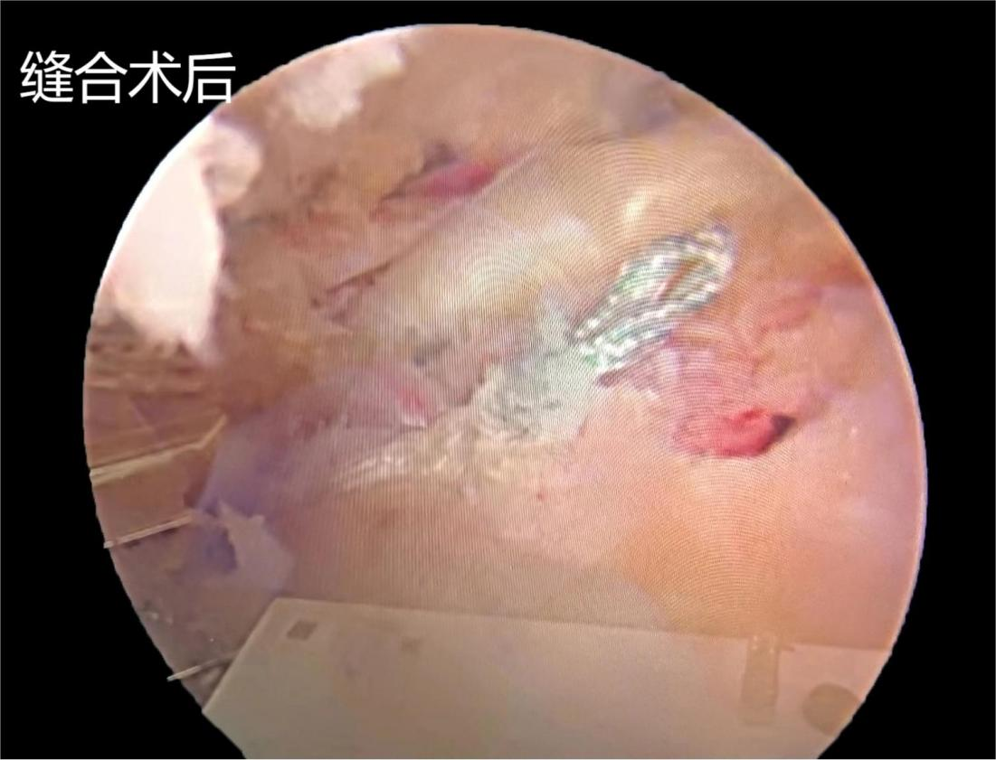 患者系“右肩疼痛,活动受限三个月”入院,入院后完善相关检查示:右冈上肌腱巨大撕裂并回缩,肩峰间隙狭窄。专科查体:右肩活动受限,落臂征阳性,空罐试验阳性,拿破仑试验阳性,肩峰撞击试验阳性。患者右肩疼痛难忍,夜间疼痛明显,严重影响睡眠,生活质量差。在全麻下关节镜下行肩袖修补术、肩峰减压成形术,术中见肩袖间隙组织增生,关节囊稍增厚,滑膜组织充血水肿,在关节镜可视化下,利用等离子射频消融电极松解肩袖间隙,切除充血滑膜组织,镜头转向肩峰下,见冈上肌腱巨大撕裂,显露肩峰,见肩峰骨赘形成,刨削增生骨赘,肩峰下间隙明显增大,冈上肌腱附着处植入内排锚钉,用缝合钩带线缝合肩袖,术后患者右肩疼痛明显缓解,术后肩关节外展包固定。